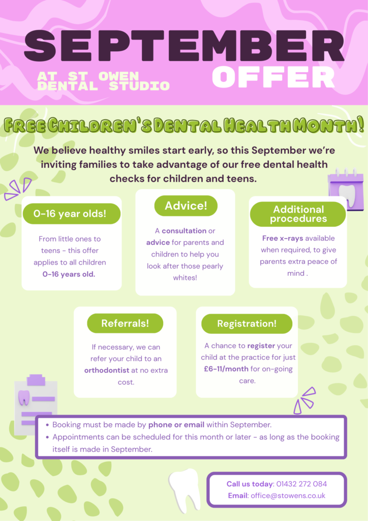 📞 To book your child’s free dental examination, please contact our reception team on 01432272084 or email us office@stowens.co.uk